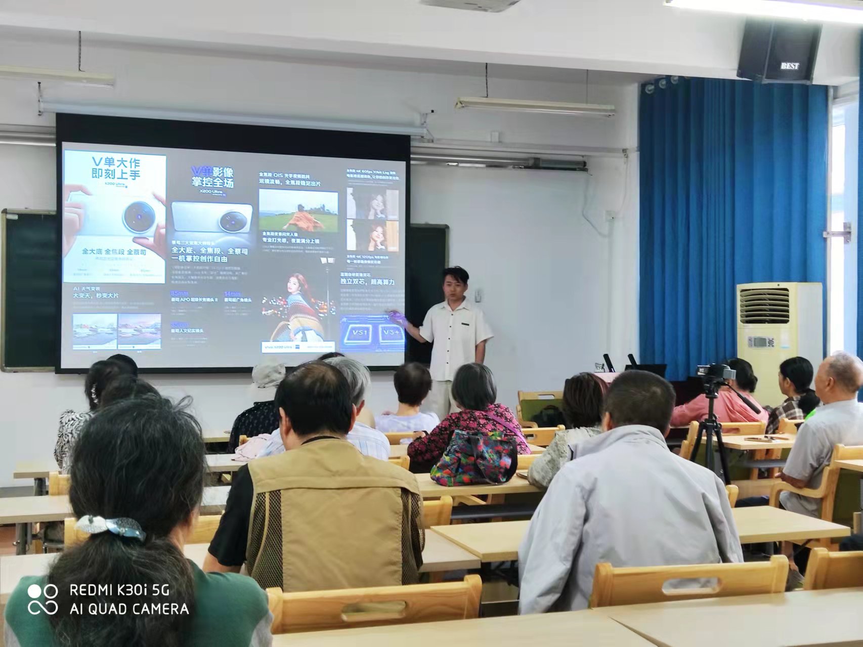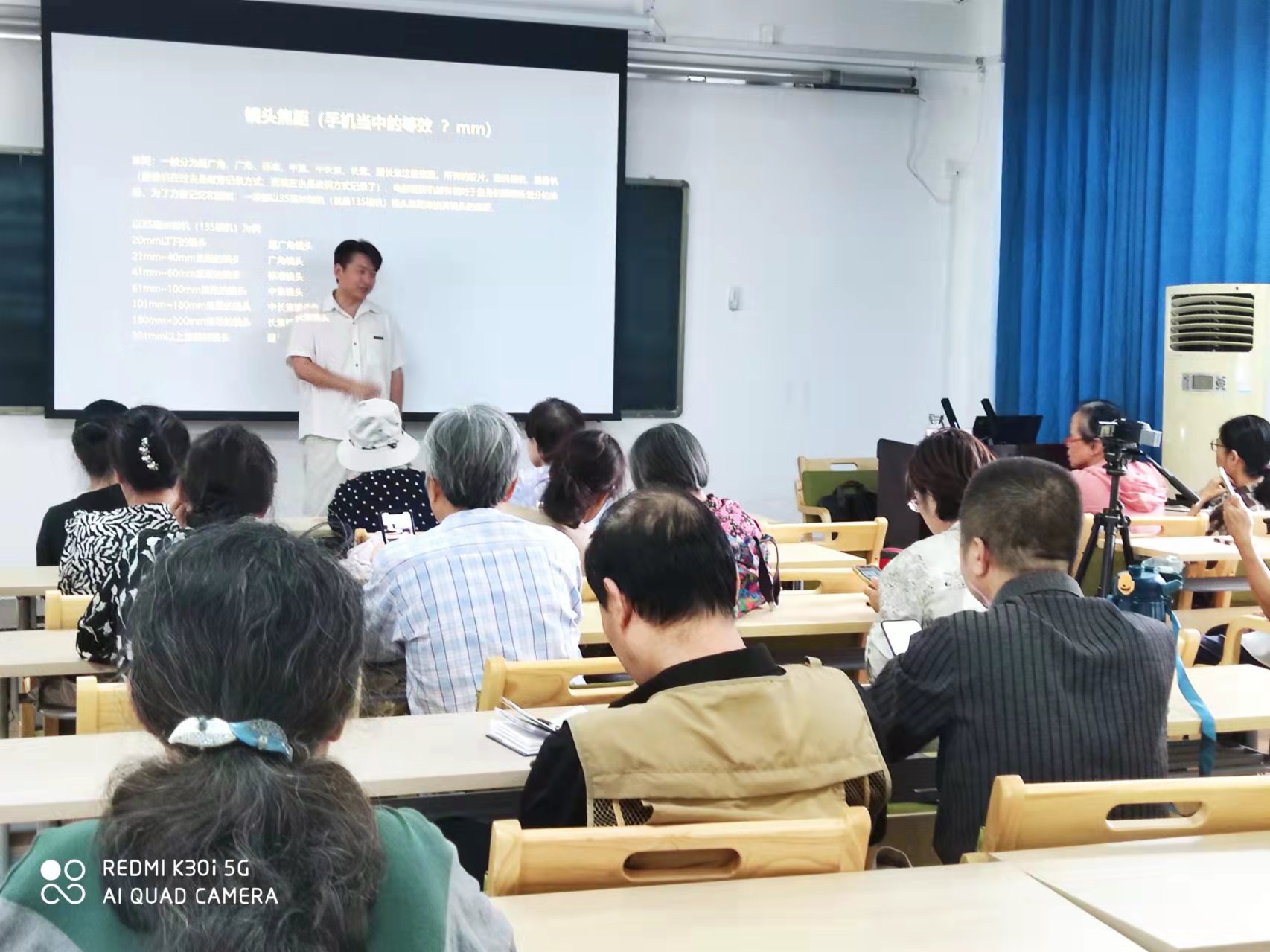 课程班特邀省老年大学袁晓科老师授课。袁老师首先介绍了课程内容涉及的手机相机基础设置,摄影常用的构图方法、技巧、软件选择及修图工具的应用,视频拍摄与剪辑等内容。讲授过程中袁老师采取理论与实践相结合的教学方式,老同志时而专注聆听、认真笔记,时而举起手机跟随讲解一步步地操作,遇到不懂的问题,袁老师则耐心为老同志答疑解惑,确保听得懂、学得会、易接受。