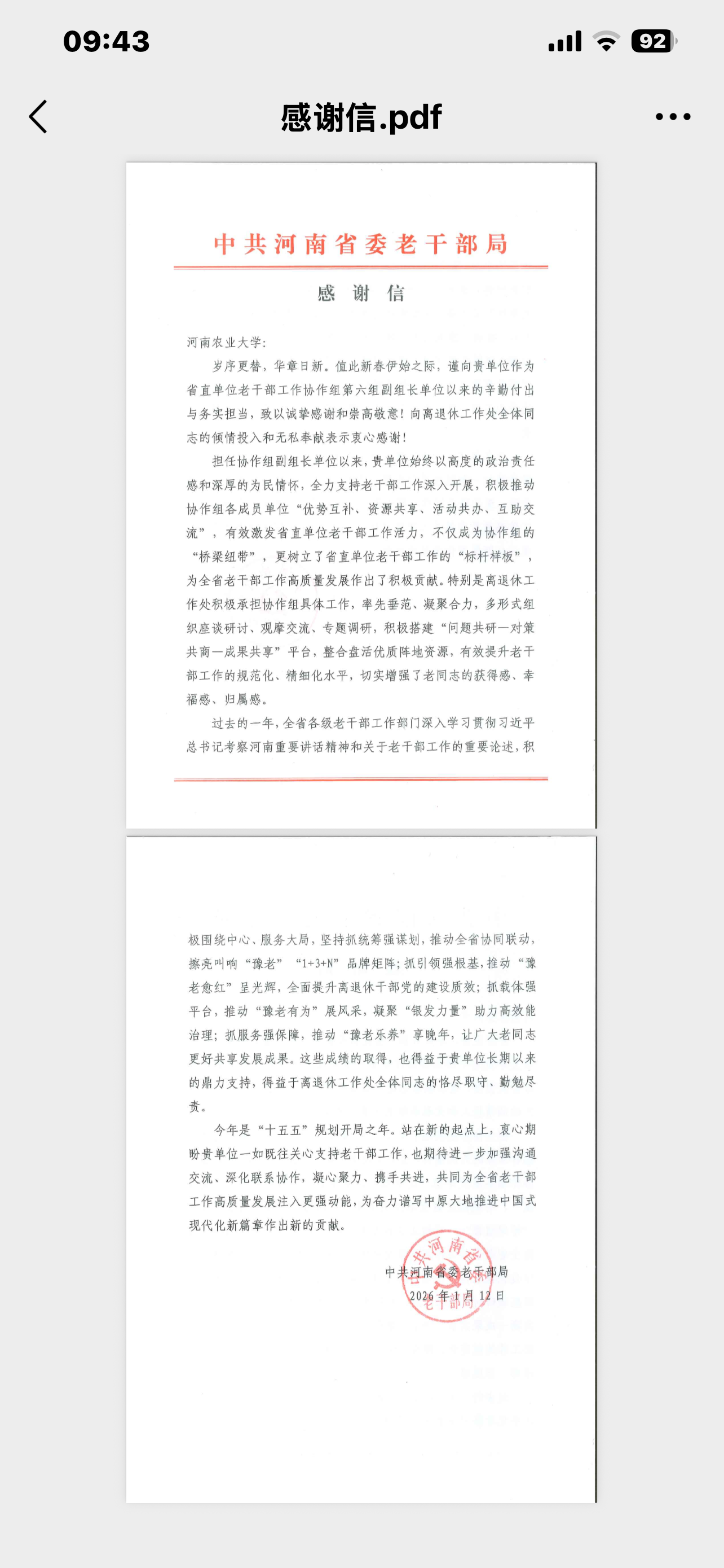 此次收到省委老干部局的感谢信,是对学校离退休工作的充分肯定。站在“十五五”规划开局之年的新起点上,我校将一如既往关心支持老干部工作,持续深化与各单位的沟通交流和联系协作,不断提升离退休工作规范化、精细化水平,切实增强老同志的获得感、幸福感、归属感,为全省老干部工作高质量发展注入更强动能。